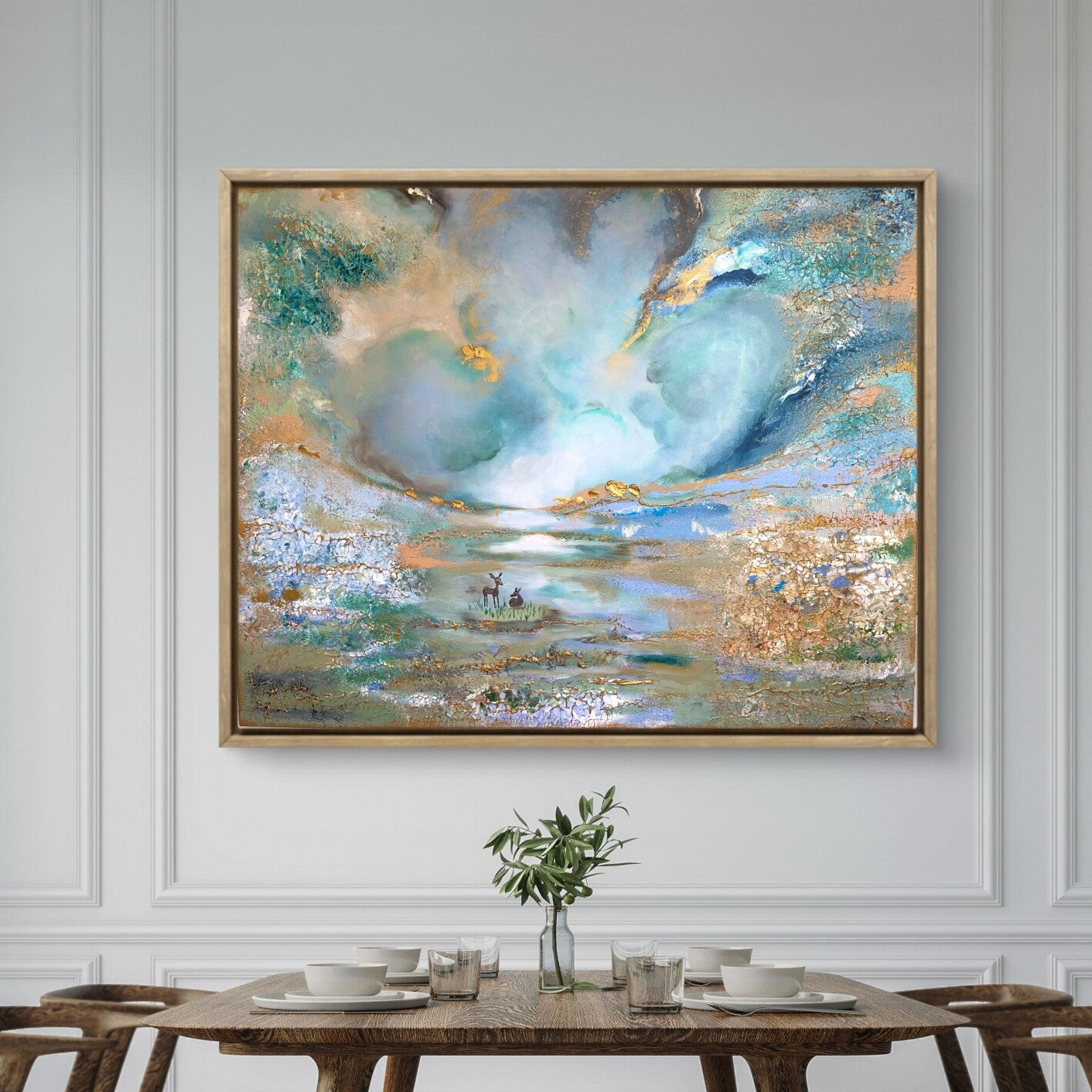This painting is inspired by the protective gaze of a mother under a sky of beautiful blues. Set within a detailed landscape, deer roam freely, creating a sense of depth and nurturing.